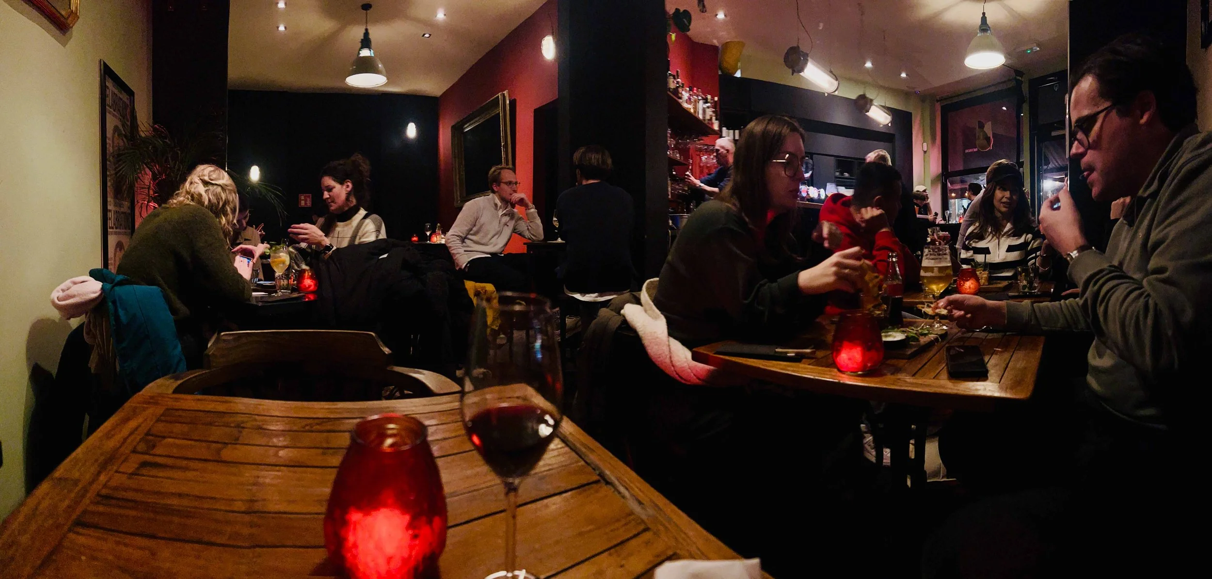 Een hoekcafé op een plein met veel horeca. Waar het in de zomer helemaal volgepakt is met terrassen. Bar d’Henri is een relatief kleine zaak, met een grote bar, waar zelfs wat mensen een biertje drinken. Gedempt licht, houten tafels. Bourgondisch. Het menu zoek je op je telefoon op. Daarop staan veel ‘apero’ hapjes en vier burgers. Verder veel cocktails. Een plek om lekker te gaan drinken en er wat casual bij te gaan snacken. Een goede barkeeper met aandacht voor de gasten en een relaxte atmosfeer. Wel opvallend veel mensen die hun borrelplank fotograferen, maar dat zal wel door dat bezoekje van de sterren komen.