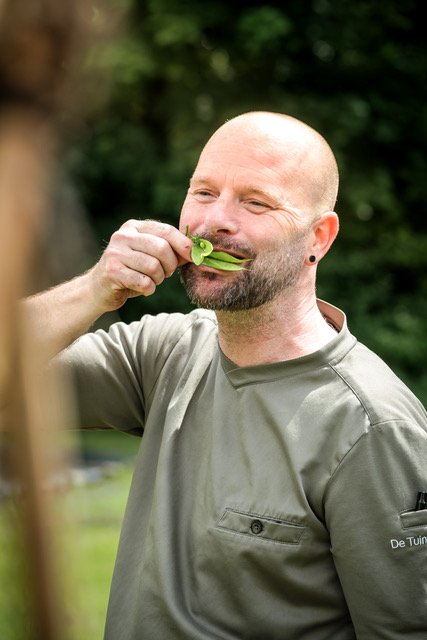 “Door dat in te plannen. Woensdag is onze mise-en-place-dag. Op donderdag en vrijdag komt de leerling erbij en gaan we samen voorbereidingen doen en de tuin in. Zaterdagmiddag hebben we tijd om nieuwe dingen uit te proberen. Dat is echt een teameffort. Ook als ik denk dat het al goed is, vraag ik de leerling wat hij ervan denkt. Ik wil dat hij het proeft zodat de nieuwe gerechten en de creativiteit ook bij hem gaan leven. In de winterperiode zijn we dicht en plant ik veel zaadjes met ideeën in mijn eigen hoofd, die hopelijk in de zomer boven komen. Als we dan tevreden zijn met het gerecht, proeven Gitta Luiten, de eigenaar van de tuin, en de sommelier het als geheel. Gitta is een hele goede proever en haalt er vaak hele kleine nuances uit, die net het verschil kunnen maken.”