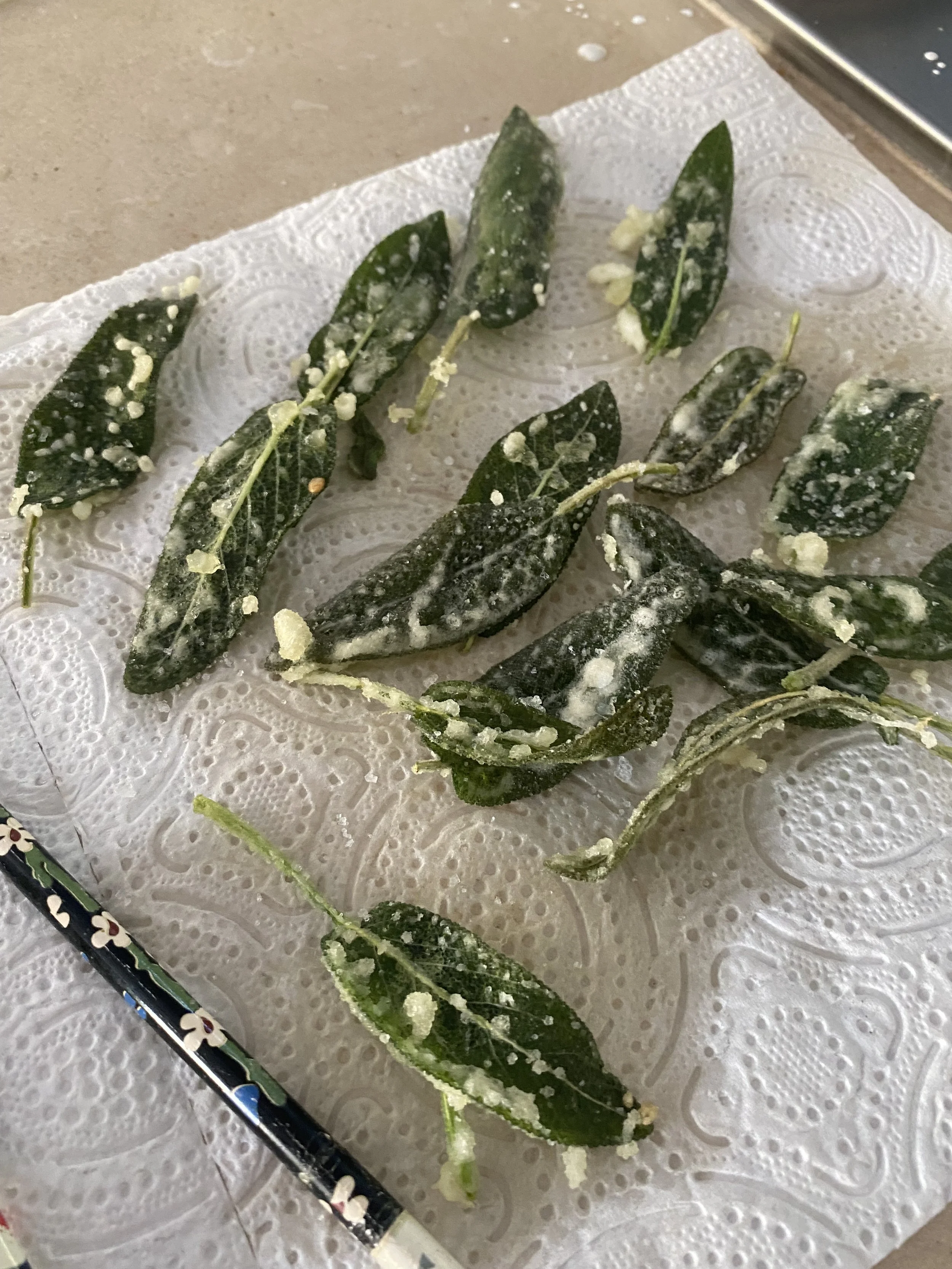 Deze salieblaadjes zijn heerlijk bij de borrel, maar dus ook op het verrukkelijke recept van Yvette van Boven voor mosselen met Guinness, room en hazelnoten. Ik maak dit recept elk jaar wel een paar keer.